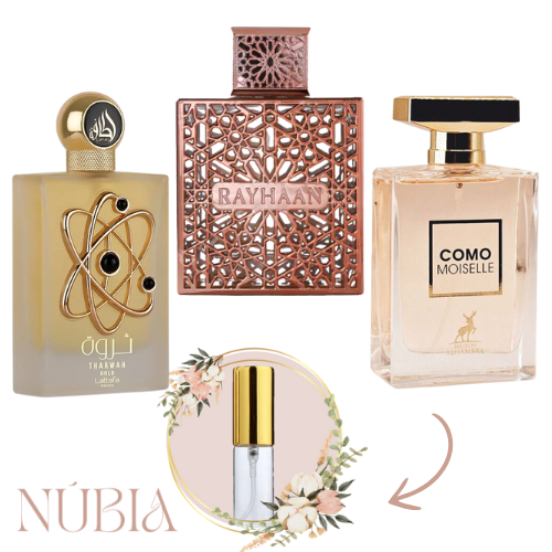 Rayhaan Divine (5 ml) — a sensação do momento: uma loucura nas redes sociais. Abre frutado (líchia, bergamota) com um toque picante de gengibre; coração floral (peónia, rosa, jasmim) e um final gourmand surpreendente de chocolate e patchouli. Viciante.