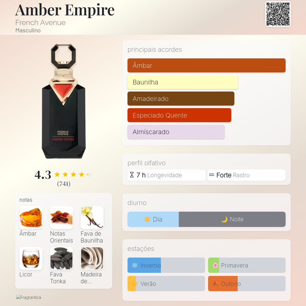 • Topo: Notas orientais · Fava de baunilha · Licor · Madeira de cashmere — uma entrada aveludada, doce e ligeiramente alcoólica que seduz desde o primeiro momento.