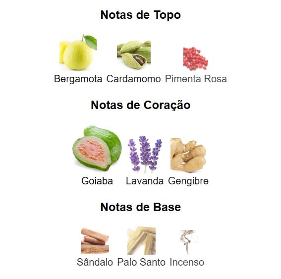 • Topo: Abertura fresca e luminosa, com um acorde cítrico refinado e um leve toque especiado que despertam a curiosidade.